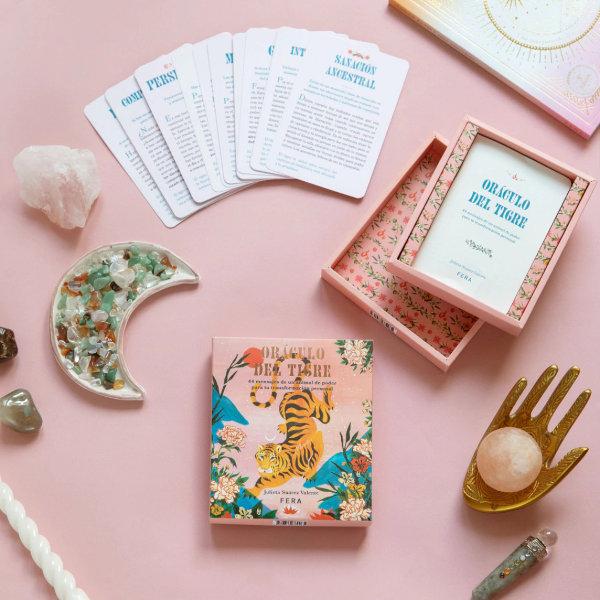 Este oráculo se compone de 44 cartas para la transformación personal. Fueron mensajes que canalizó Julieta Suárez Valente, astróloga y tarotista a través del tigre Oliver, su animal de poder. Estos mensajes no quedaron en meras palabras: Julieta las ha experimentado en cuerpo y alma a lo largo de todo su camino. En el dossier encontrarás ejemplos personales, anécdotas y confesiones relacionadas a cada una de las 44 propuestas de las cartas.