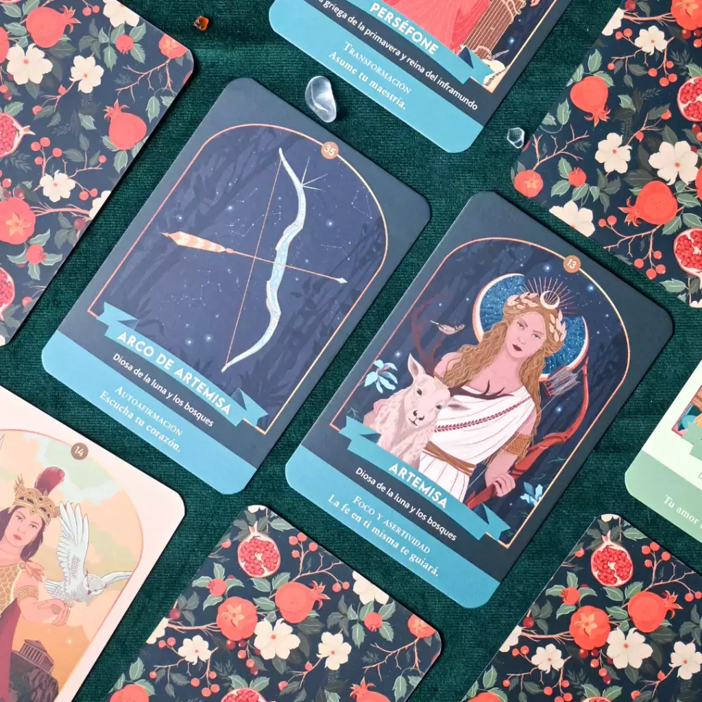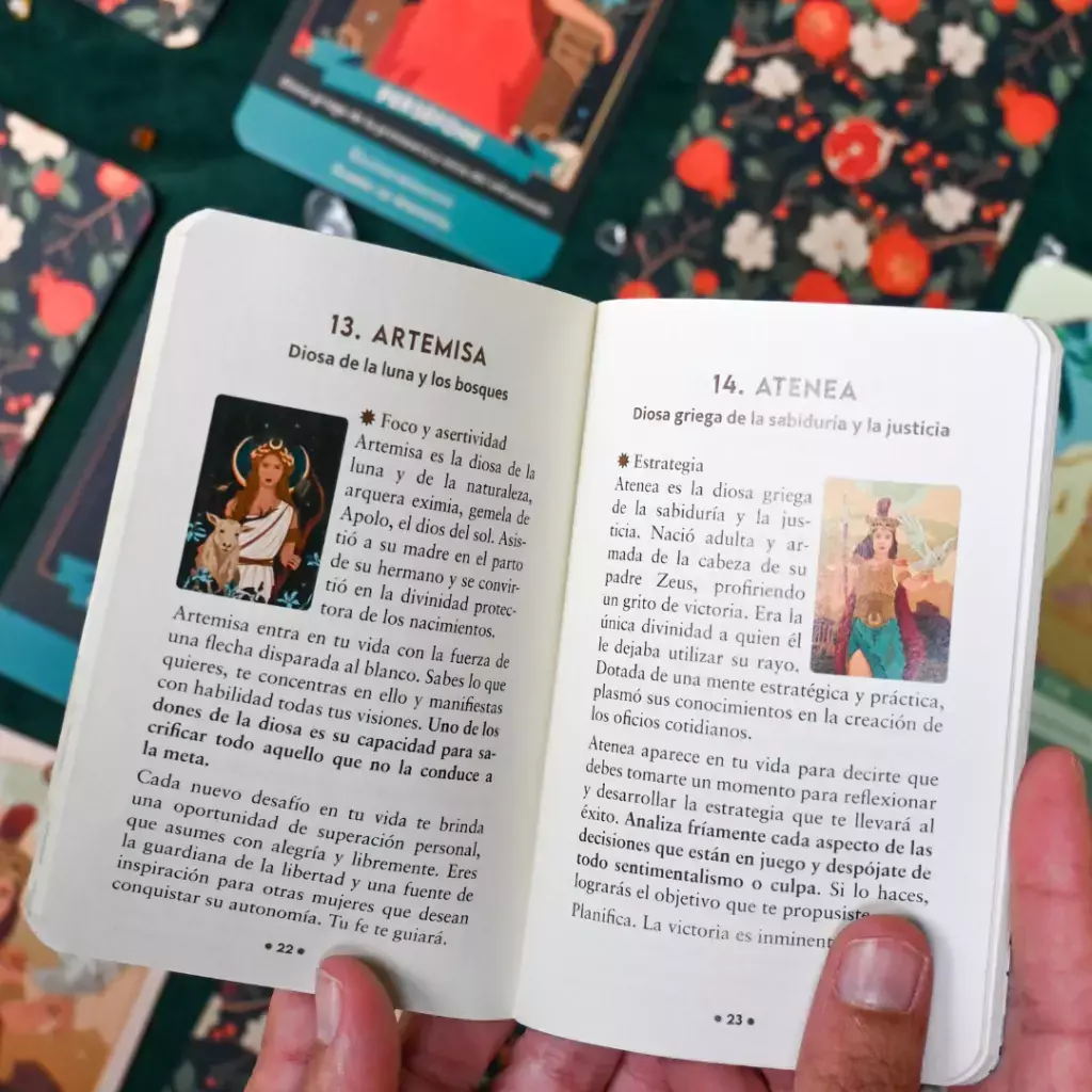 Oráculo Diosas mitológicas contiene 44 mensajes para conectar con la sabiduría divina. Presenta 22 diosas de distintas culturas y sus amuletos de poder. Estos amuletos simbolizan atributos y advertencias que han asistido a las deidades de sus mitos.